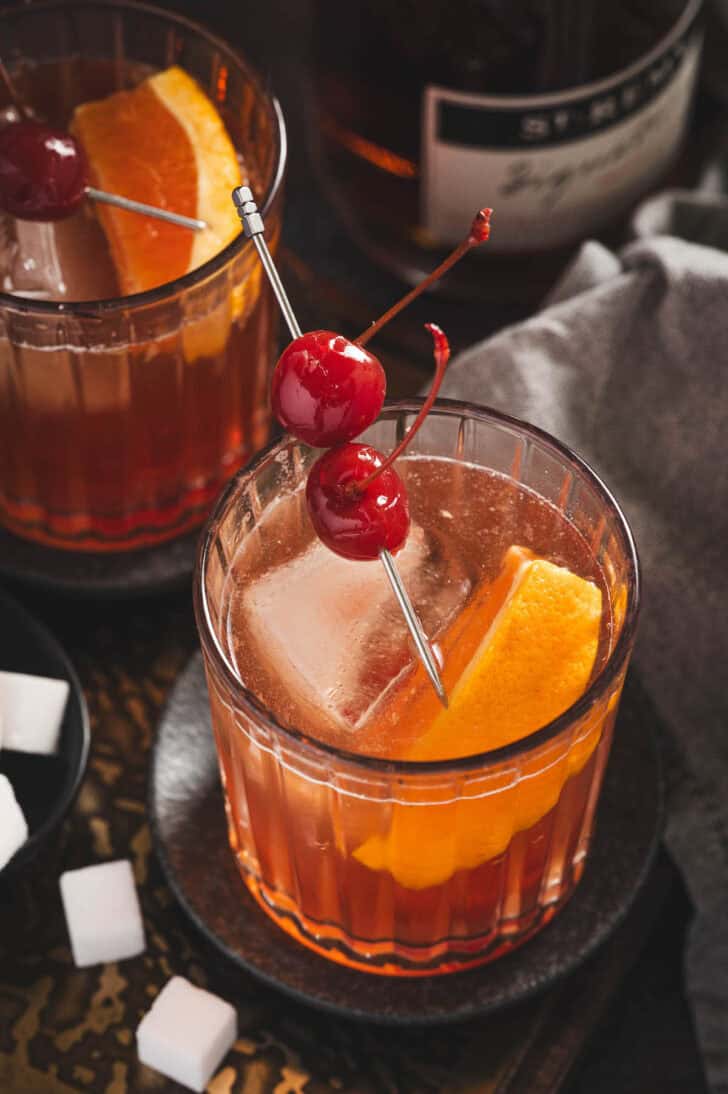 - MUDDLE + STIR. In a double old fashioned glass, muddle the cherries, cherry juice, orange slice (orange peel and all), sugar and a few dashes of bitters until everything is crushed and somewhat blended together. Add the brandy and stir until everything is well combined and the sugar completely dissolves into the brandy.