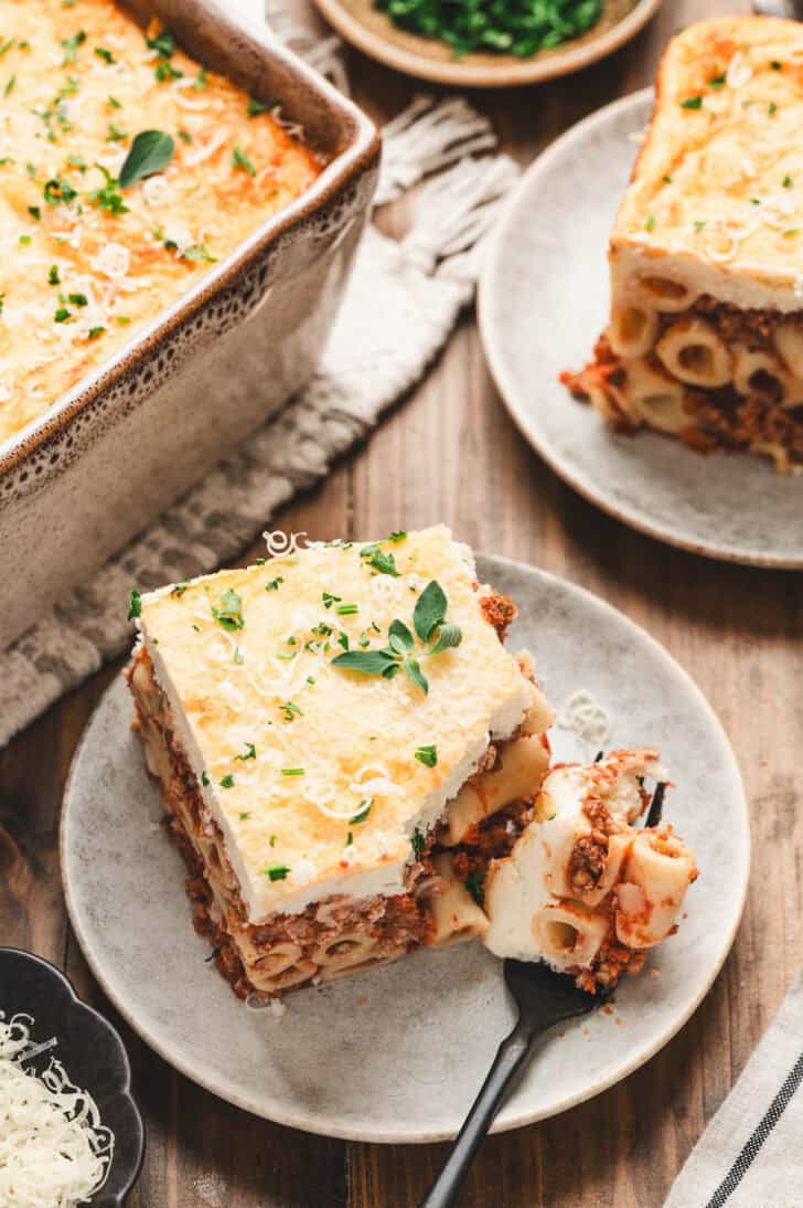 Looking for an authentic Greek Pastitsio recipe? This Greek lasagna is layered with rich meat sauce and creamy yogurt bechamel. Make it ahead or freeze for later.