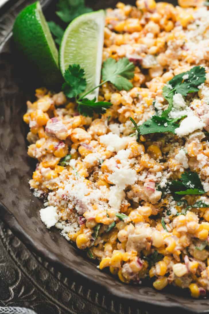 Elote is usually corn on the cob with creamy toppings, cheese and chile. Esquites is the off-the-cob version served in a bowl or cup. So this Mexican corn salad is technically closest to esquites.